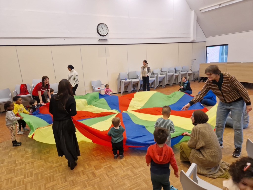 We komen samen in de grote zaal, een fijne en ruime plek met volop mogelijkheden. Hier staat een grote kast gevuld met speelgoed en knutselmaterialen. Er is speelgoed voor baby’s, peuters en kleuters, en ook een zacht babykleedje zodat de allerkleinsten veilig kunnen ontdekken. Kinderen puzzelen, bouwen, knutselen en luisteren naar een verhaaltje, terwijl ouders met elkaar in gesprek gaan en ervaringen delen over opvoeding, nieuwe fases en soms ook slapeloze nachten.