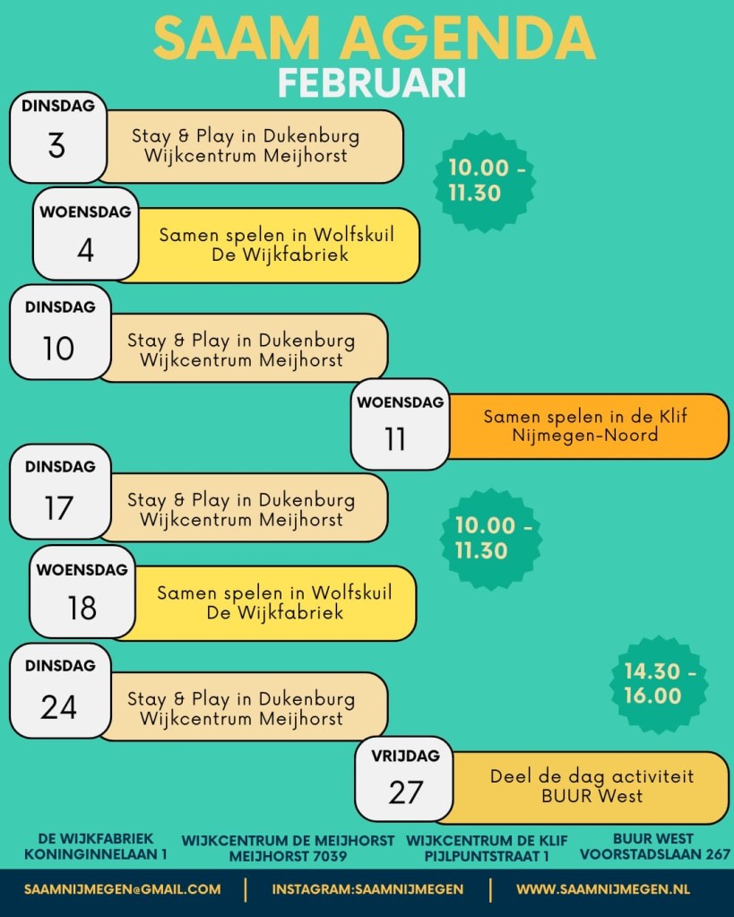 Elke maand publiceren we een planning voor onze speelmomenten. Voor februari 2026 zijn dat de volgende momenten. Aanmelden voor de speelochtenden is niet nodig. Iedereen is van harte welkom!
